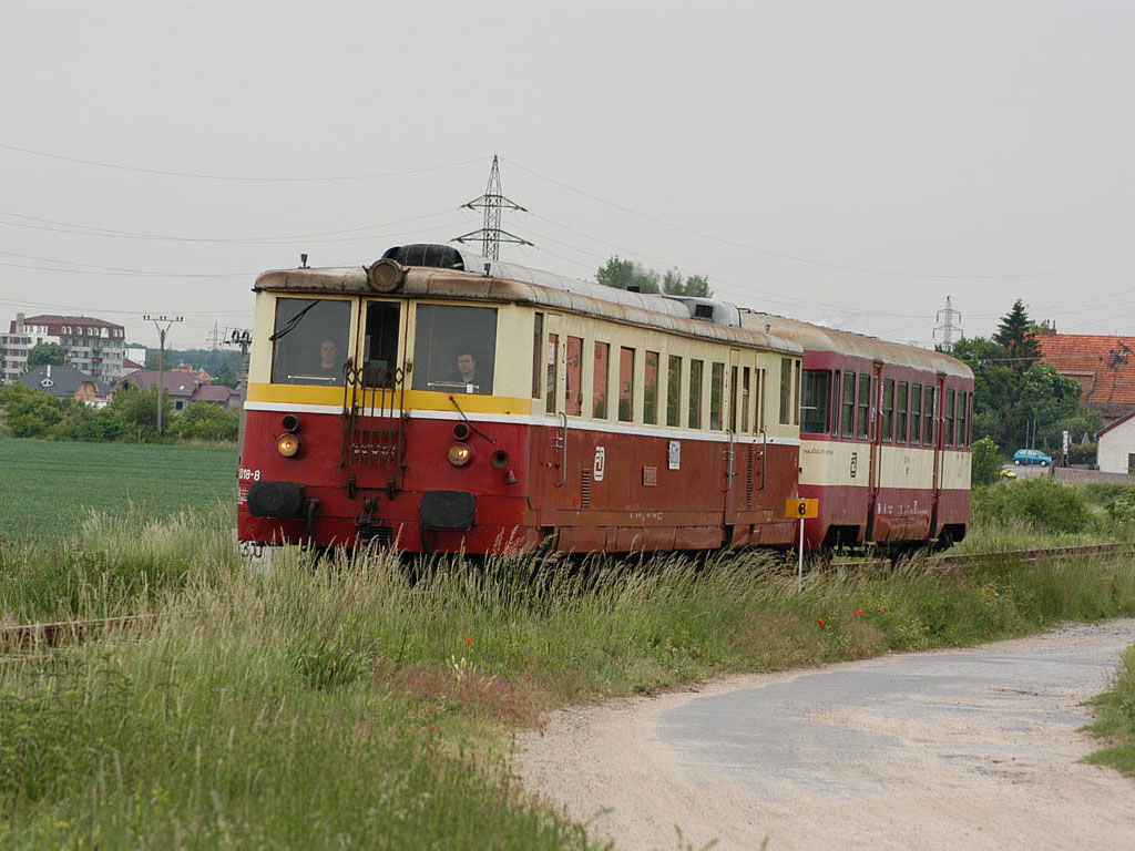 BŘECLAV - Na dobu školních výletů bude jezdit osobní vlak do Lednice ne jen o víkendech ale denně. Pouze namísto víkendového motorového vozu M 131.1463 s přívěsem stejné konstrukce jezdí pro školní výlety motorový vůz 830 018 obdobné věkove kategorie, také s přívěsem. Na snímku je souprava zachycena před zastávkou Charvátská Nová Ves. Obrázek vlevo - motorový vůz 830 018-8 jede do Lednice s přípojným vozem Bix.