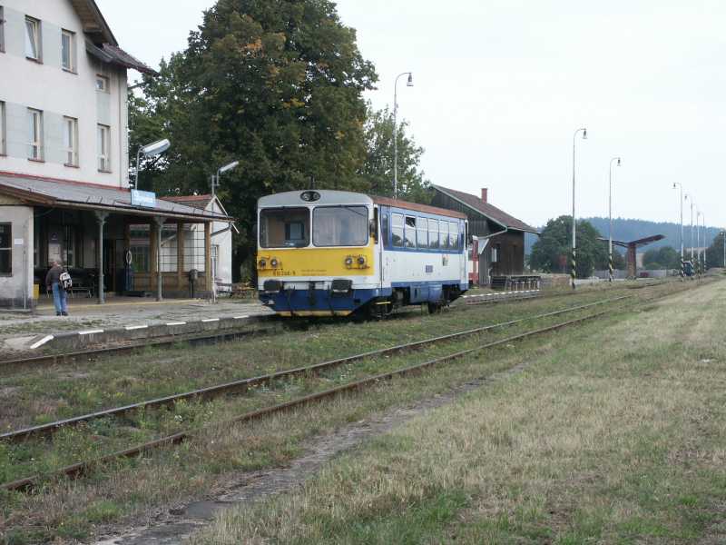 V současné době probíhá na trati Rybník - Vyšší Brod - Lipno rozsáhlá výluková činnost, jež souvisí se změnou trakčního napětí. Původní trakční vedení v úseku Rybník - Vyšší Brod klášter je sneseno vyjma asi dvousetmetrového úseku přiléhajícího k vyšebrodské stanici, aby zde mohly posunovat i stroje řady 113. Mezi Rybníkem a Rožmberkem jsou sneseny i původní sloupy, naopak již hotové jsou betonové patky pro nové. V dopravně Rožmberk ještě stojí několik původních sloupů, dále cca po Herbertov je trať již také bez sloupů, některé leží ještě podél tratě. Asi 2 km nejblíže k Vyššímu Brodu sloupy ještě stojí. Výluky probíhají zpravidla v denní době po vlaku 20902, přičemž prvním vlakem jedoucím po celé trati je Os 20910. Základna EŽ je ve Vyšším Brodě klášteře, zde jsou deponovány i náležitosti, prostory PJ využívají stroje ČD i EŽ. Kromě rekonstruovaných "prasátek" zde EŽ využívá "hektora" 720.091. Právě tento stroj přivezl montážní vlak do Vyššího Brodu cca ve 14.45 hod. Po provedení posunu byl odstaven v depu. Tento čas se nebude příliš měnit, neboť v tu dobu se již připravují náležitosti pro vlak 20910, pozdější manipulace vozidly EŽ by tuto skutečnost mohla komplikovat. V souvislosti s výlukami je zcela jinak organizována nákladní doprava, a to převážně v nočních hodinách v době cca 18 - 02 hod. Nákladní dopravu zajišťuje stroj 749 z Rybníka do V. Brodu, dále ř. 113. V případě větší zátěže vypomůže "barča" i dále do Loučovic. Na vlečce zajišťuje posun "hepeta", ale řada 749 zde má také přechodnost. Zde také stojí asi na půli cesty mezi stanicí a zastávkou původní dřevěný sloup. Provoz v osobní dopravě se liší v závislosti na výluce. Pokud výluka není, jsou vedeny všechny (!) vlaky nezávislou trakcí, a to vozem 810 (v našem případě konkrétně 810 313-7) a zpravidla na krátký oběh počínaje vlakem 20931 řadou 749 s jedním béčkem. Zbrojení naftou se děje v Horním Dvořišti, případně z kanystrů ve Vyšším Brodě. V případě výluk je NAD zavedena v úseku Rybník - Vyšší Brod klášter u vlaků 20905, 20906, 20931, 20908 až do Loučovic, 20909 z Loučovic a 20910. Motor 810 pak vozí vše kromě vlaků 20910, 20915 (který oproti JŘ jede denně bez omezení jízdy), 20912 a 20925 jež jsou vedeny řadou 113 s béčkem. U vlaků 20912 a 20915 je ve Vyšším Brodě klášteře přestup z resp. do 810/113. Jak je tedy vidět, poslední dva mohykáni řady 113 si příliš nezajezdí, ale buďme ještě chvíli vděčni alespoň za to. Stejnosměrný provoz bude možný do 19. 3. kdy se jedna velká kapitola na lipence navždy uzavře. Na přiloženém snímku -zhm- je bohužel již historická událost. Lokomotiva 100 003-3 s osobním vlakem v žst. Vyšší Brod klášter. V současnosti je tato lokomotiva společně s 100 002-5 v Táboře. Obě mají být jako zdroj náhradních dílů pro 100 001-7, která bude zachována pro muzejní účely.