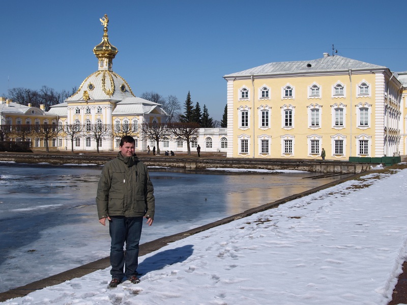 Prigirodny poezd projel vzdálenost 30 km za 35 minut. Během cesty probíhal jakýsi jarmark, pět prodavačů nabídelo různé zboží, od DVD přes ručníky, plastové obaly na doklady až po hřebeny. Vlak zastavil ve stanici Novyj Petergof opět načas. Odtud jsme se vydali autobusem k paláci (jezdí všechny autobusy 35× vyjma 357). Vystoupili jsme na 5. zastávce a před námi byly již vidět zámecké zahrady a vchod do areálu. V Petrodvorcích jsme si prohlédli exteriér paláce, prošli jsme se po zahradách a dostali se až k zamrzlému Finskému zálivu, kde v létě přistávají lodě z Petrohradu.