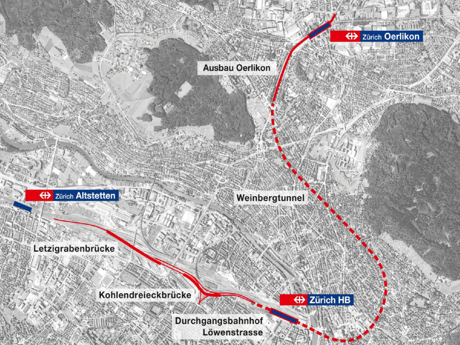 Z podzemí hlavního nádraží opačným směrem trať vystoupá na povrch a následují jednokolejné mosty Kohlendreieckbrücke (394 m) a Letzigrabenbrücke (1 156 m), které poslouží pro bezkonfliktní výjezdy do regionálních a dálkových kolejí trati na Bern a Basilej.
