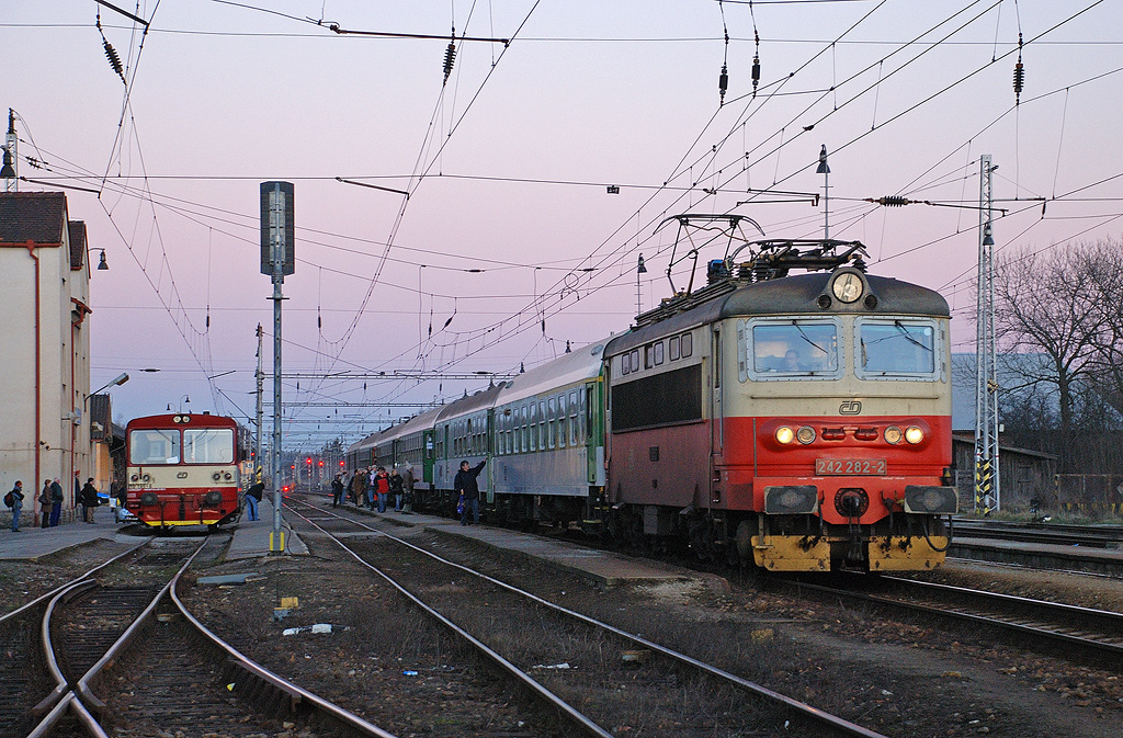 Zdravím všchny. Děkuji za komentáře a řeknu Vám k tomu své. Tato scéna mne uchvátila při příjezdu rychlíkem od Českých Budějovic. Proto jsem neváhal a ihned po výstupu pádil na "palpost". Bohužel pro zachování alespoň slušnější kresby a nepříliš brutálního použití ISO (a přesto už CCD s 400 ISO bojuje) jsem musel nastavit delší čas a jelikož jsem neměl stativ (který bych stejně nestihl rozložit) musel jsem aparát položit na návěstidlo. Stihl jsem udělat pouze jeden snímek a ten tady vidíte. Ano, podívám-li se na to z pohledu ultrašotouše bude to snímek šumící, nenasvícený a celkově "podprůměrná stanicovka kde by žádný ultrašotouš neměl v životě fotit". Záměrem bylo zachytit tuto atmosféru a na snímku je taková jakou jsem si představoval a jaká tou dobou panovala. Jinak vlevo stojí blatenský 810.195.
