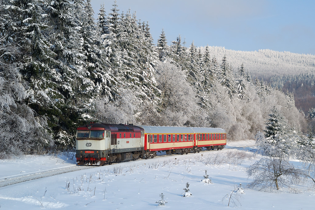 D.Š.: Díky za informaci o sklonu. Tak to ještě předčilo mé očekávání! Pamatuju si z klukovských let, že jeden takový sklnovník býval za přejezdem mezi Ostružnou a Brannou (směrem dolů) a tam snad bylo těch cca 30, ale když jsem tam byl před 3 lety, tak už tam nebyl (asi se jím někdo kochá doma před spaním :-)). Zkoušel jsem tam fotit od toho přejezdu vlak jedoucí do kopce, ale taky ten kopec není moc poznat. Paxem si říkal, že by to možná chtělo z protější stráně (není celá zalesněná, jsou tam louky). Na trati je kus rovinka (v tom skoro největším stoupání) a měl by jí i v dalších zatáčkách být vidět kus, jak leze po úbočí nahoru. Ale nedovedu si představit, jak bych tam lezl teď v tom sněhu. Snad se sněžnicemi, nebo se skamarádit s yetim, aby mě tam vzal na zádech... :-)