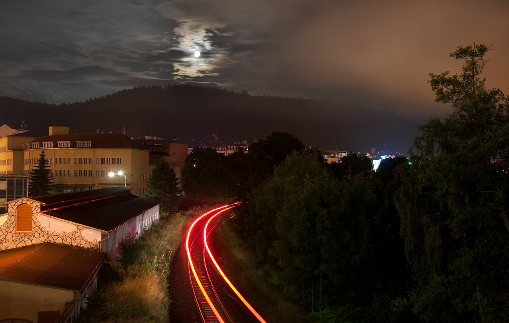 Krásný záběr, ale na blbym místě. Vymlácený styk na kolejích mně dojímá stejně jako úžasná obloha s mlhou zprava. Jenže ta osvětlená hmota hnusných nově nastříkaných objektů vlevo to celé degraduje na nepřipravenou momentku.