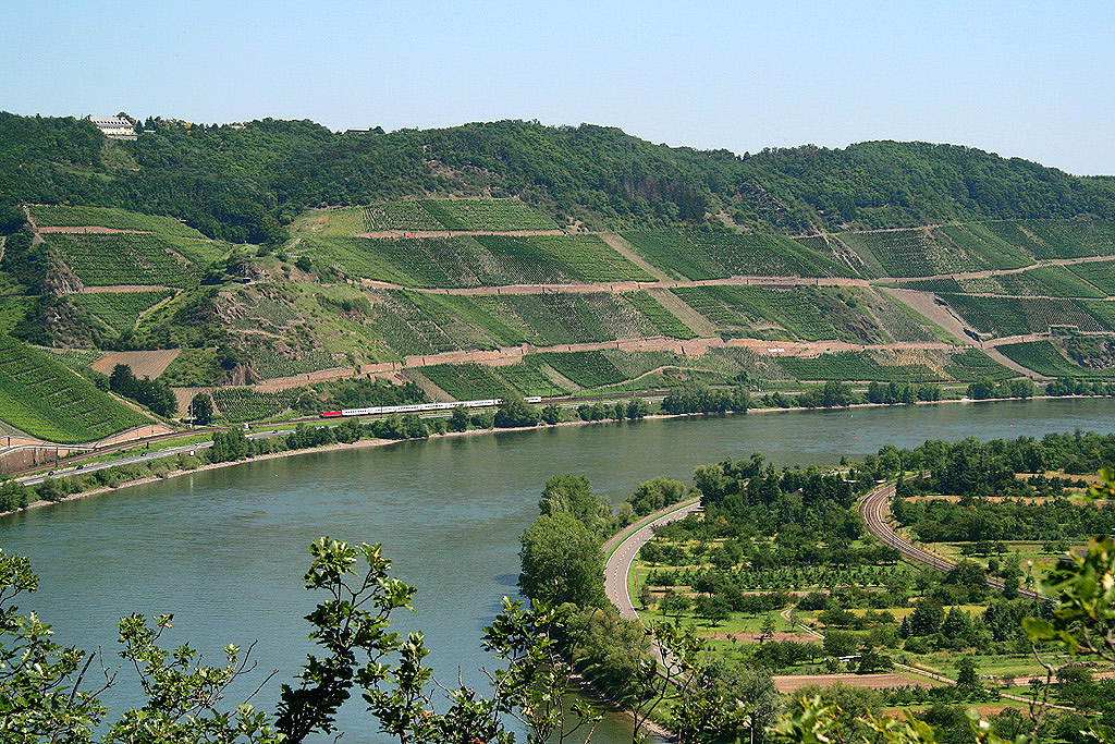 Jen zřídkakdy dělám takové fotky, taky mám radši, když je vlak víc vidět. Nicméně toto místo je výjimečné - vlak jede podél největší zákrutě Rýnu "Bopparder Hamm". V roce 2002 byl tento úsek zapsán do Seznamu světového dědictví UNESCO.
