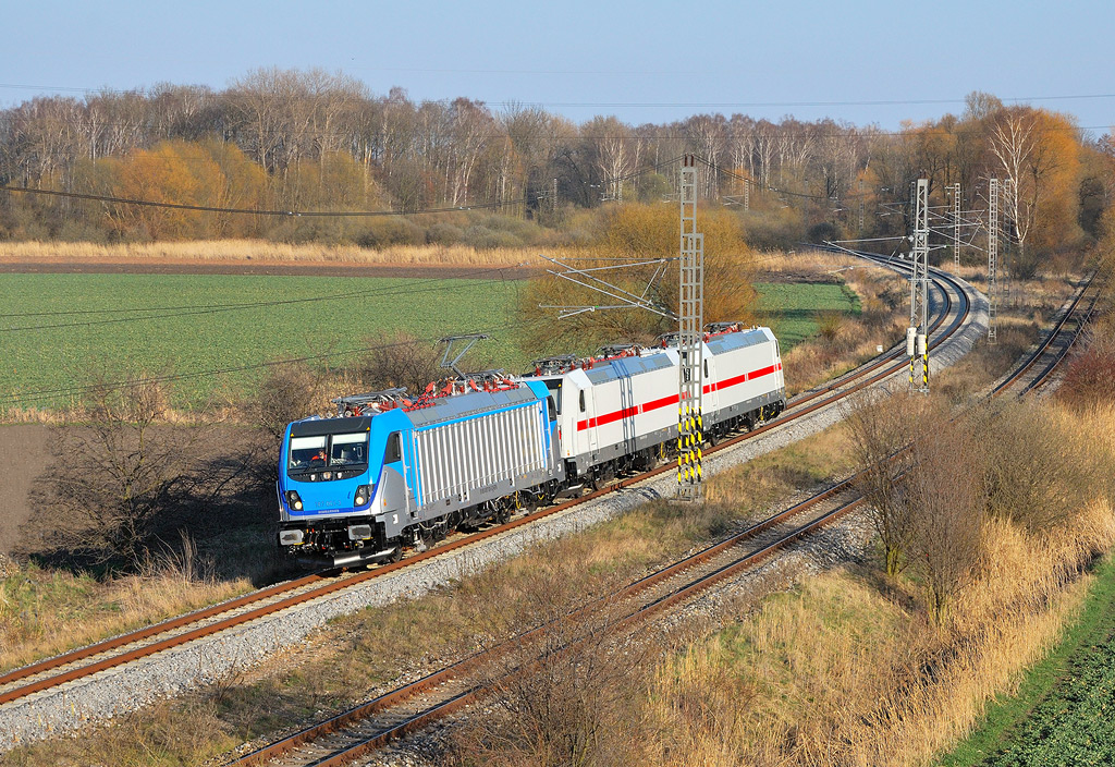 Pěkné foto! K těm TRAXXům pro DB Fernverkehr jsem v ŽM 3/13 četl, že si to Němci objednali, načež si ale uvědomili, že by bylo dobré, aby to pro dálkovou dopravu umělo 190 km/h namísto "pouhých" 160 km/h. Prý budou nějak "zváženy možnosti", ale přijde mi, že 190 km/h by mohlo být na TRAXX docela hodně už jen proto, že to má tlapový pohon. Tak uvidíme...