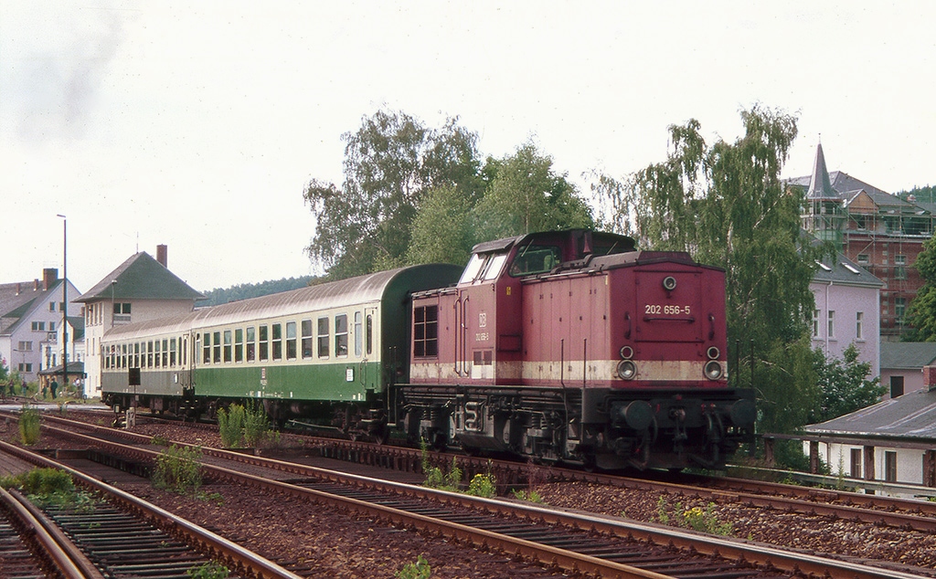 topič: především v 1. polovině 90. let, do masovějšího příchodu motorových jednotek - nejdříve to byly zánovní 628.2/928.2 ze západní části Německa, pak už i nové 642 a jiné - to byly na území bývalé NDR vcelku běžné soupravy, používaly se i starší vozy řady Bm opět ex DB, než se staly zdrojem pro modernizace...