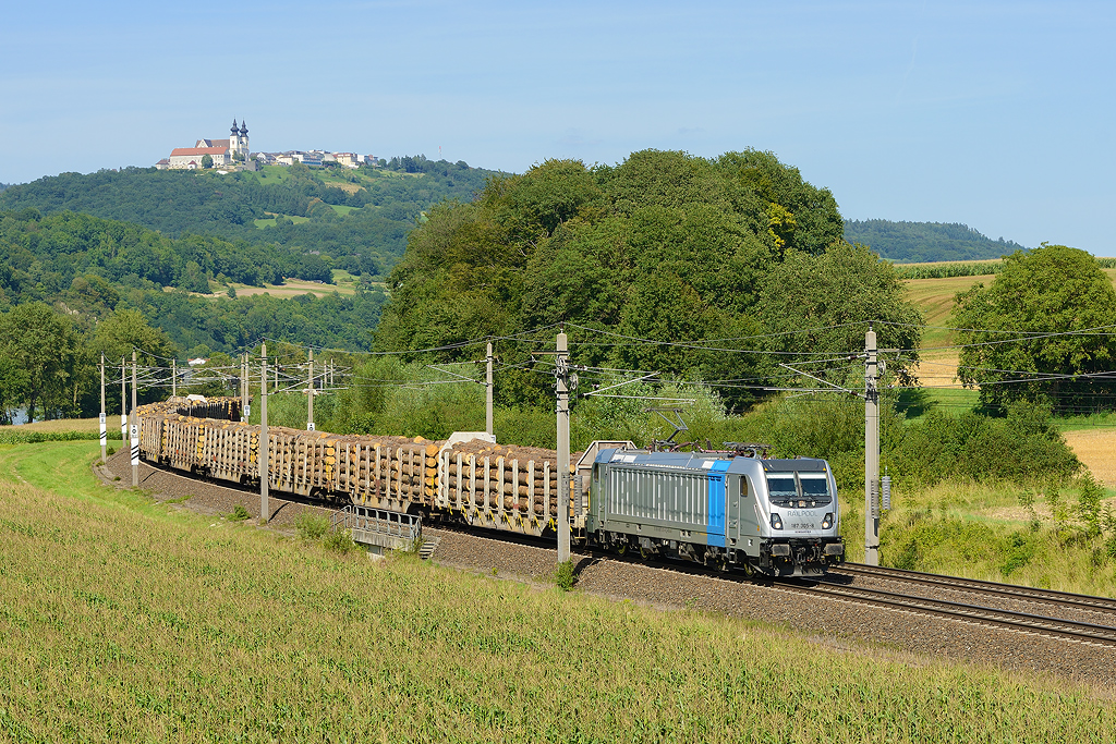 - V pozadí na kopci stojí poutní bazilika v Maria Taferl - místu, které dalo název i pro nádraží "pod kopcem" v obci Marbach (nádraží se jmenovalo Marbach-Maria Taferl). Ovšem trať přes Marbach (levobřežní vedlejší trať) je v úseku Emmersdorf - Yspersdorf (či až Sarmingstein) již cca 8 let zrušena.