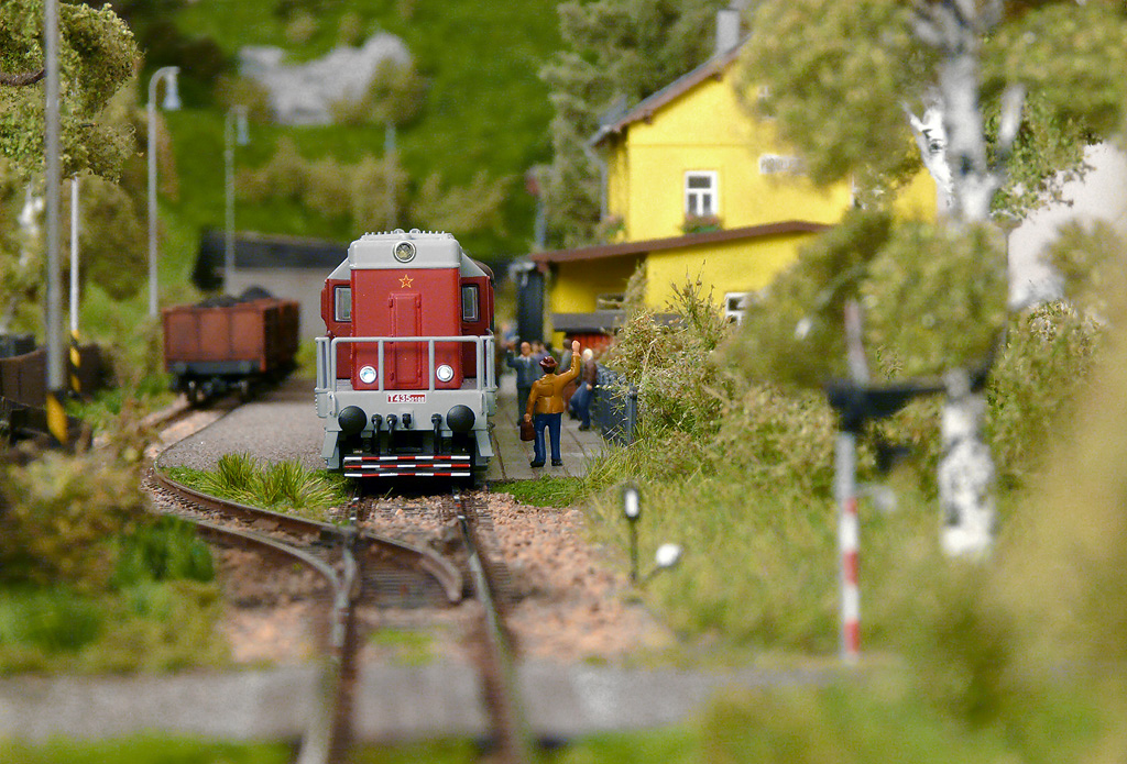 Jéžíšmaríjapannosvatokopecká! Jakej náklon!?! Jaká deformace? To je modelově věrné ztvárnění! Výdyť ten barák je rovně a mašina? Věrně a úměrně době jsou holt koleje poněkud podmáčené a pod pražci je "kapsa", tak se trošku zhoupla. A co? To bylo normální. Holt nejde o hlavní tak pro přepravu uranové rudy do CCCP, tak sem neposlali dlouho podbíječku, ani manuálně zdatné Železniční vojsko.