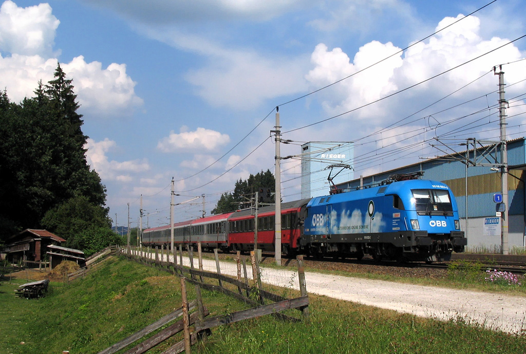 Je vidět, že modrý taurus se moc neujal. A já ho přitom Railmanovi záviděl, protože jsem stál vedle něho a mračil se na právě došlé baterie ... jinak k autorově škodě, ovce "sekající" v ohradě trávu těsně před příjezdem vlaku odešly mimo záběr. Jinak by to byla asi hodně pěkná kombinace vesnického prostředí Salzburska a moderního koridoru Západní dráhy.