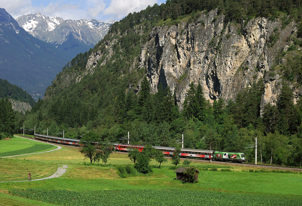 Hasič: V podstatě dvouhodinový takt EC, do toho nějaké regionalzugy. A v době MS ve fotbale asi i hromada posiláků, ale na ti odpoví spíš Tomáš. Pravidelný jízdní řád je tady, mrkni se sám. (Úsek mezi stanicemi Roppen a Imst-Pitztal.)