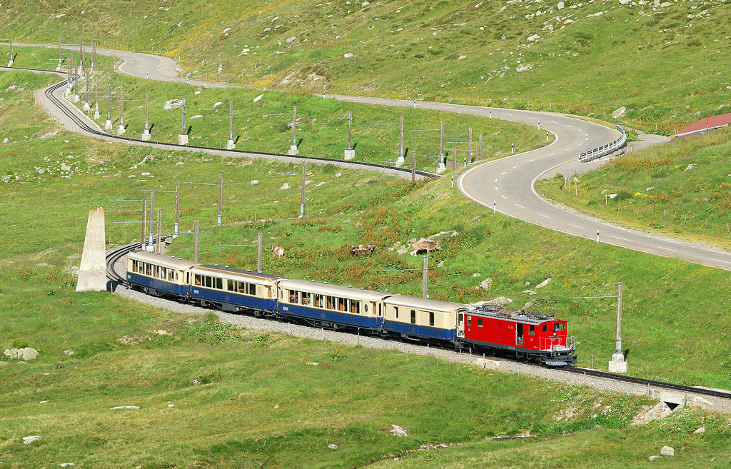 3. a 4.7. 2011 to jelo v opačné trase s tím, že tenhle historický krokodýl MGB /Matterhorn-Gotthard-Bahn/ vlak táhl z Zermattu do Disentisu, kde opět nastoupil krokodýl RhB. Něco málo k této mašince zde: http://de.wikipedia.org/wiki/HGe_4/4_I