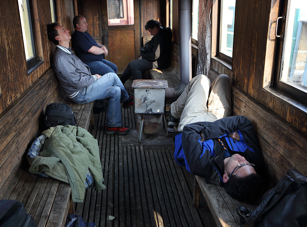 Trochu mi to přípomíná kdysi dávno cestování na úzkorozchodce Wolkenstein-Jöhstadt, jen s tím rozdílem, že tam byly lepší lavice (sedačky)...ale po celonoční jízdě z Brna jsem vypadal tak nějak podobně..