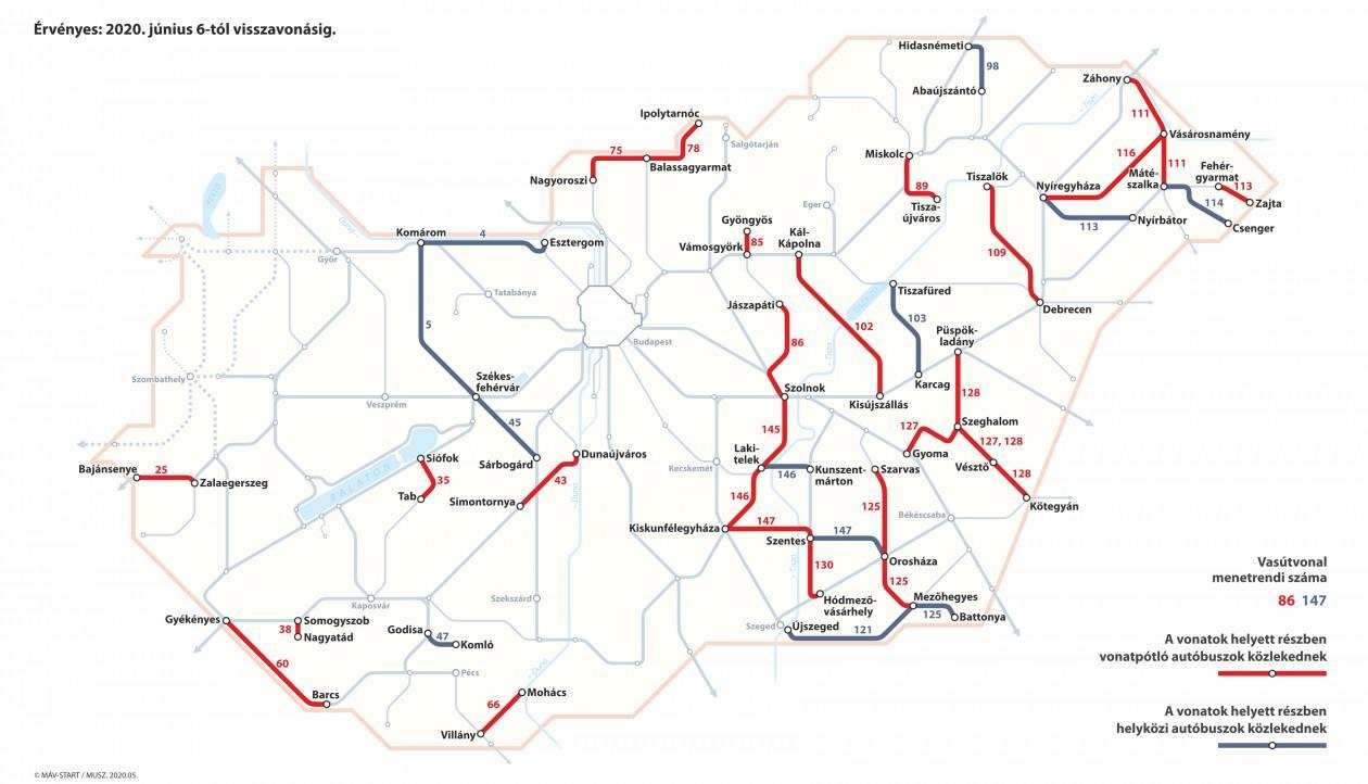 Maďarsko — Od 6. června 2020 vstoupila v platnost úprava jízdního řádu v Maďarsku, která změnila podobu provozu na nejméně vytížených lokálních tratích. Dopravce MÁV se v souvislosti s epidemií nového koronaviru rozhodl pro změnu organizace osobní dopravy na celkem 34 lokálních tratích. Důvodem dle dopravce je masivní úbytek cestujících až 70 %, proto bylo přistoupeno k redukci železničního provozu a uspořené finanční zdroje využít k posílení provozu na páteřních tratích. Vzhledem k velmi slabému využití těchto lokálních tratí by tyto rozsáhlé změny organizace dopravy měly postihnout pouhé 4 % cestujících.