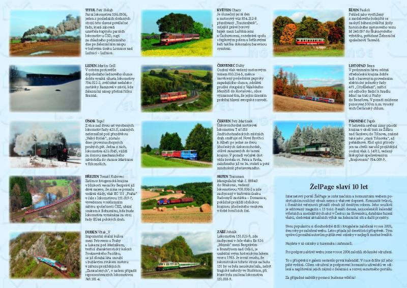 Kalendář zachycuje tuzemskou železniční současnost objektivy autorů z fotogalerie ŽelPage. Vydáním kalendáře je pověřeno tradičně nakladatelství Ermat Praha. Koupí kalendáře podpoříte existenci tohoto serveru. Věříme, že vám kalendářem opět uděláme radost.