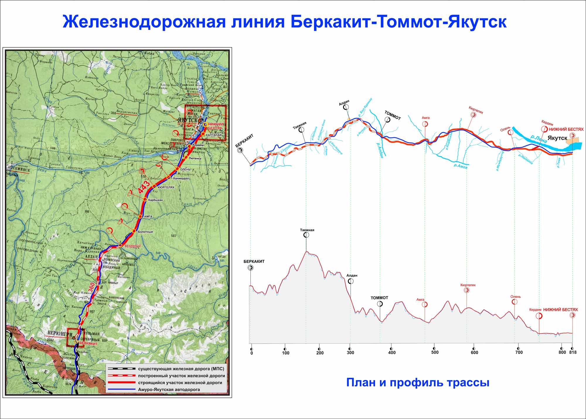 Historie této železnice začala již ve třicátých letech minulého století. V roce 1935 byl dokončen úsek spojující Transsibiřskou magistrálu s městem Tynda, ležícím na plánované trase Bajkalsko-Amurské magistrály (BAM). Během II. světové války byl však tento úsek snesen a koleje byly využity na frontě. Po válce byl zastaven i projekt samotného BAMu. Na počátku sedmdesátých let se stavba BAMu opět rozběhla a obnovení se tak dočkal i úsek do města Tynda (km 179), který byl zprovozněn v roce 1976. Stavba však pokračovala dále na sever, úsek do Berkakitu (km 390) byl zprovozněn v roce 1979 a železnice byla také rozšířena do uhelných dolů u města Nerjungri (km 416), do kterého začaly osobní vlaky jezdit až v roce 1984. Stavba pokračovala, byť v menší míře, i po zhroucení Sovětského svazu. Města Aldan (km 686) dosáhla v roce 1992, města Tommot (km 767) pak o tři roky později.