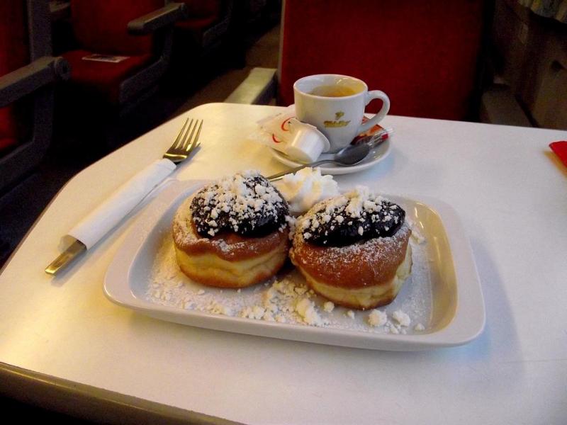 Velkou výhradu mám však ke způsobu servírování příboru "à la čtvrtá cenová". Nejen, že máte příbor položený ne zcela hygienicky na stolku, ale navíc vám zbude jeden potrhaný zmačkaný ubrousek pro další použití. Tento způsob servírování kritizoval například i Roman Vaněk ve svém pořadu Peklo na talíři. Ve vlaku je samozřejmě nedostatek místa, aby se servíroval příbor na dalším talířku, ale vždyť JLV již má přijatelný způsob, jak servírovat příbory, který využívá např. v SC Pendolinu, tak proč jej nevyužívat i v ostatních jídelních vozech? Nutno dodat, že vdolky byly chutné, nicméně trpěly syndromem usmaženého, a poté ohřátého jídla – jistě tu zvláštní chuť znáte sami. Pravděpodobně bych si je již znovu nedal, na rozdíl od předchozích lívanců. Espresso mělo pěknou cremu, která se i po zamíchání znovu objevila. Hodnocení chuti kávy nechám na odbornících, nicméně značka, kterou používá JLV, nepatří mezi komerční kávy, které bych standardně vyhledával pro jejich chuť. K jídlu na snídani bych však asi raději doporučil některou „slanou“ variantu (omeletu, sázená či míchaná vejce) místo této sladké. Za vdolečky zaplatíte 45 Kč, za espresso 35, v menu celkem za 75,–.