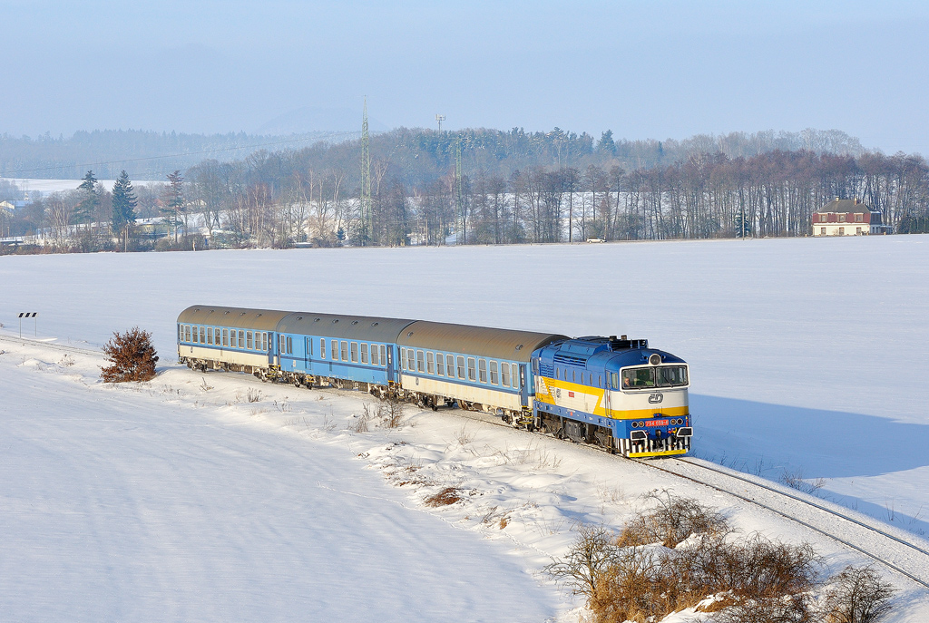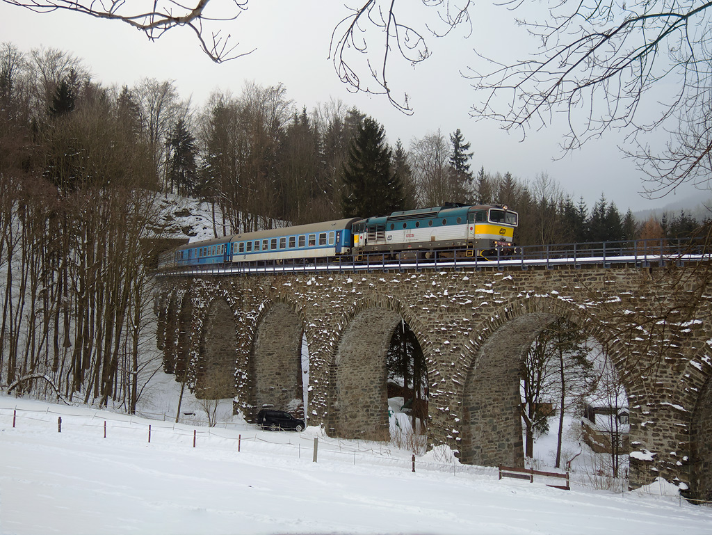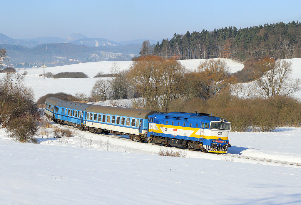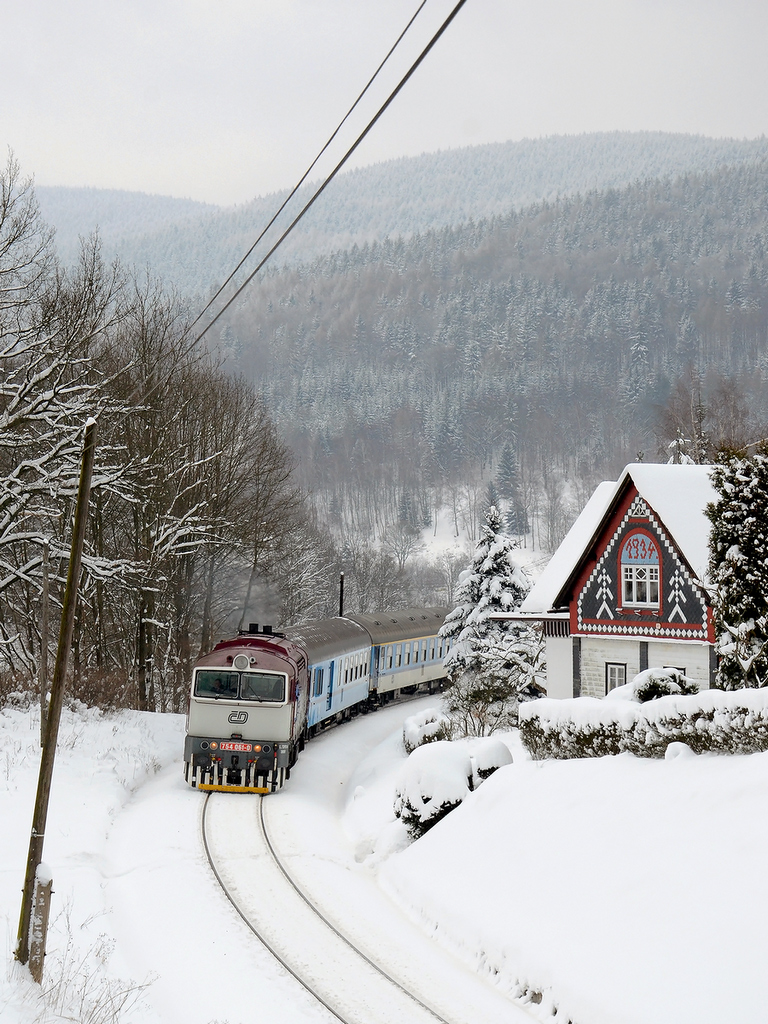 Liberec — Nový rok 2017 začal ve znamení vydatného sněžení proloženého silnými mrazy. Tyto náročné podmínky se promítly i v železničním provozu na Liberecku. Zprvu za motorové vozy 843 zaskakoval liberecký brejlovec 754.048. Provozní jednotka Děčín reagovala nasazením lokomotivy 754.061 se dvěma vozy klasické stavby, tentokrát náhradou za motorové jednotky 844. Jednalo se zpravidla o vlaky 1999/6606/6611/6614. K úplnému vyřešení situace, tak aby bylo možné mít v Liberci stále záložní lokomotivu, napomohl příjezd českotřebovského brejlovce 754.059. Ten do Liberce dorazil 11. ledna na R 1268 společně se třemi klasickými vozy. Hned následující den se zapojil do služby na ústeckých rychlících, konkrétně 6600/1174/1161/1168/1167/1162/1173. V neděli však Os 6600 nejezdí, a tak se souprava objevovala na následujících vlacích, tedy R 1172 nebo 1170 s navazujícím oběhem. V současnosti zima a s ní i mimořádnosti ustávají – o uběhlém víkendu nebyla vypravena ani jedna náhradní souprava.