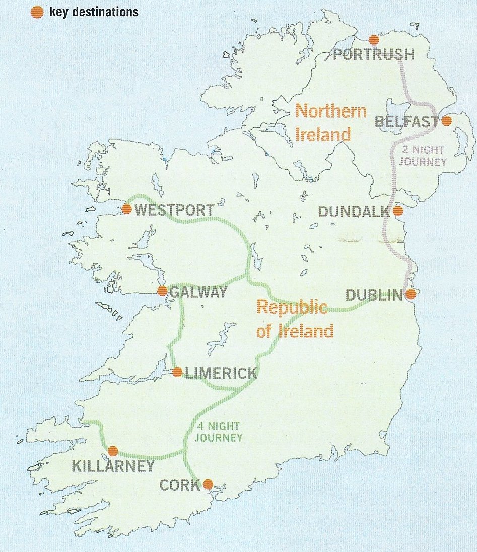 Výhodou irské železniční sítě je, že není příliš přetížená, takže vlak může v noci zůstat ve stanici u nástupiště a ani ráno nebudete moc rušeni ranními spoji. Na druhou stranu je irská železniční síť relativně malá, takže na prohlídky mnohých pamětihodností musíte použít z nádraží autobus. Anebo třeba koňské povozy.